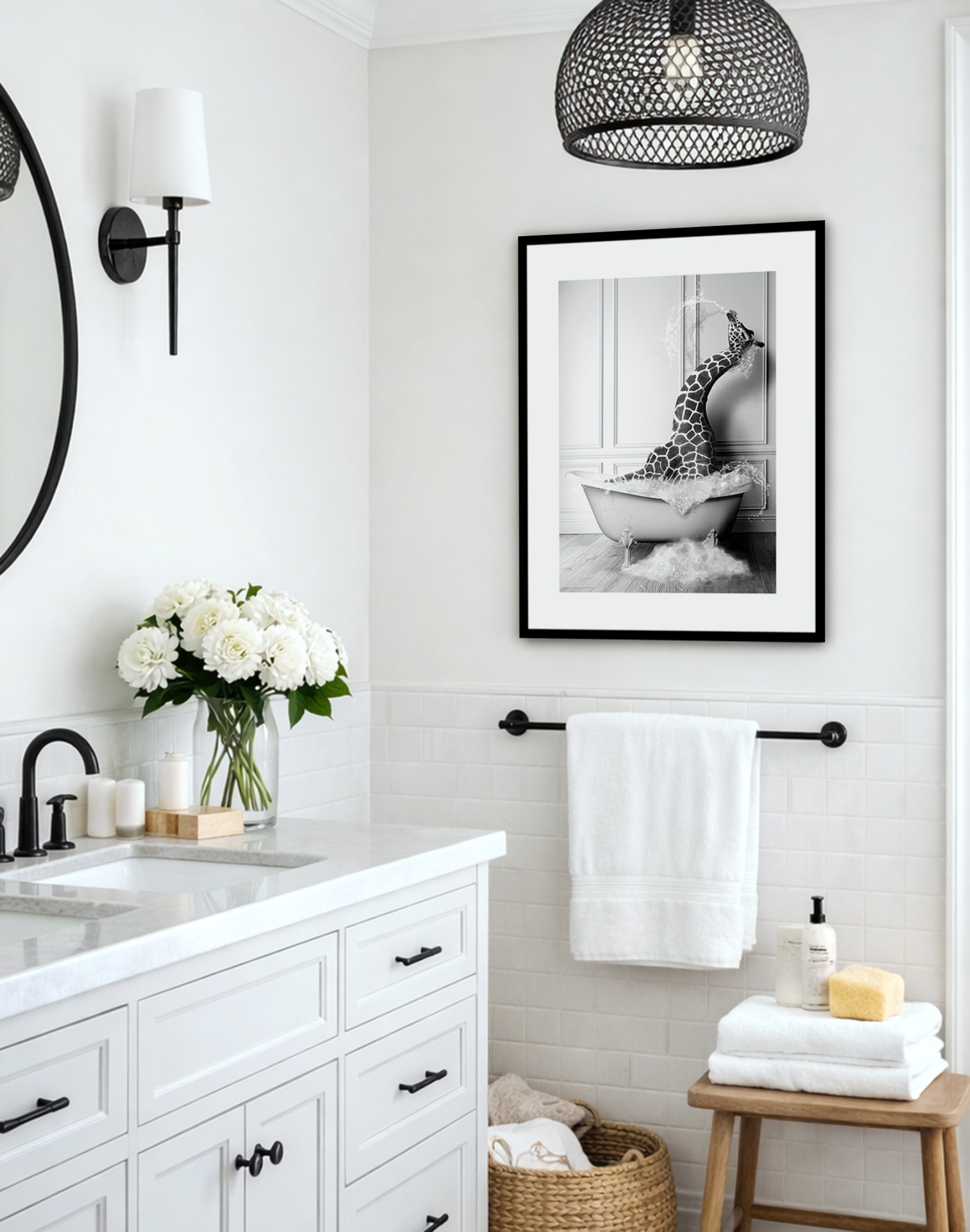 Dê vida à sua casa de banho com nosso quadro decorativo Girafa no banho, que apresenta uma cena lúdica de uma Girafa a divertir-se na banheira.