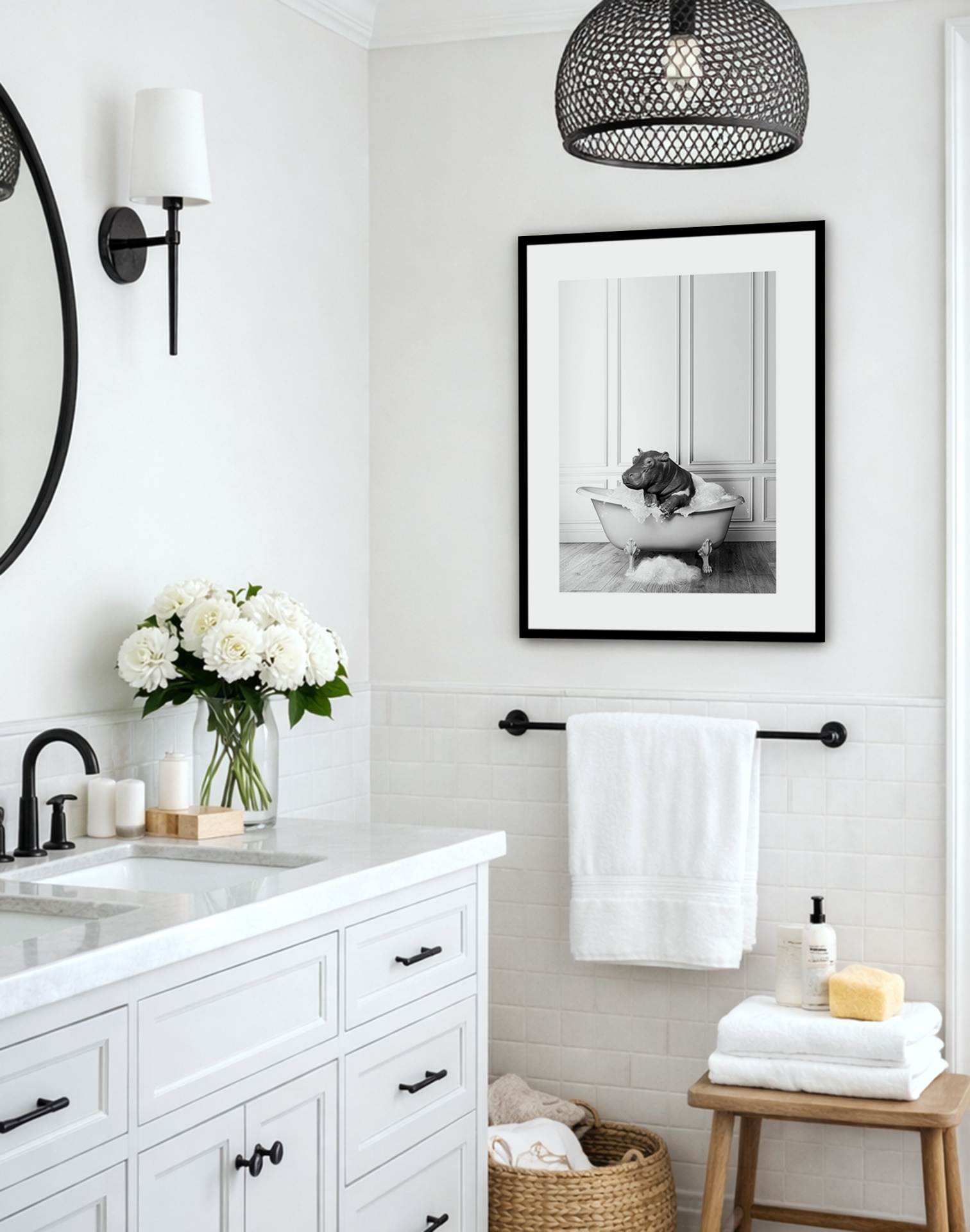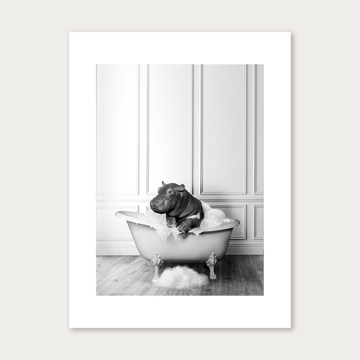 Dê vida à sua casa de banho com nosso quadro decorativo Hipopótamo no banho, que apresenta uma cena lúdica de um Hipopótamo a divertir-se na banheira.