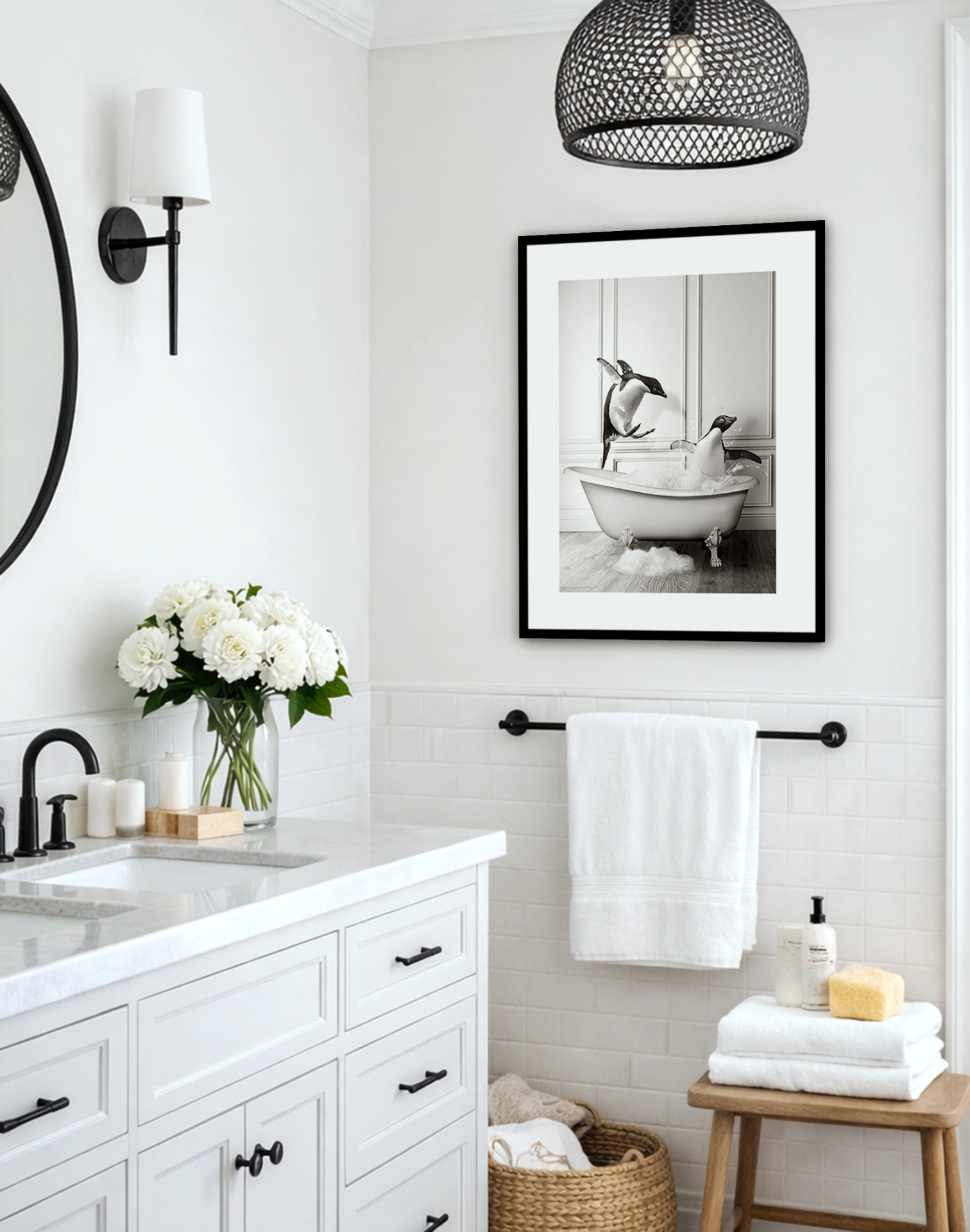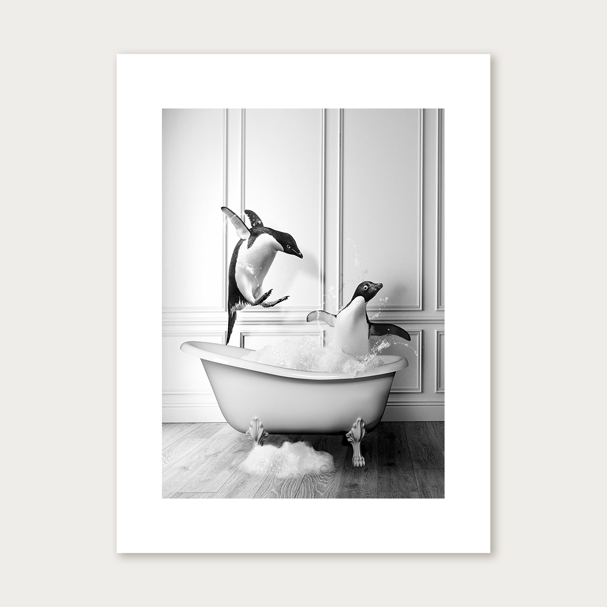 Dê vida à sua casa de banho com nosso quadro decorativo Pinguins no banho, que apresenta uma cena lúdica de pinguins a divertirem-se na banheira.
