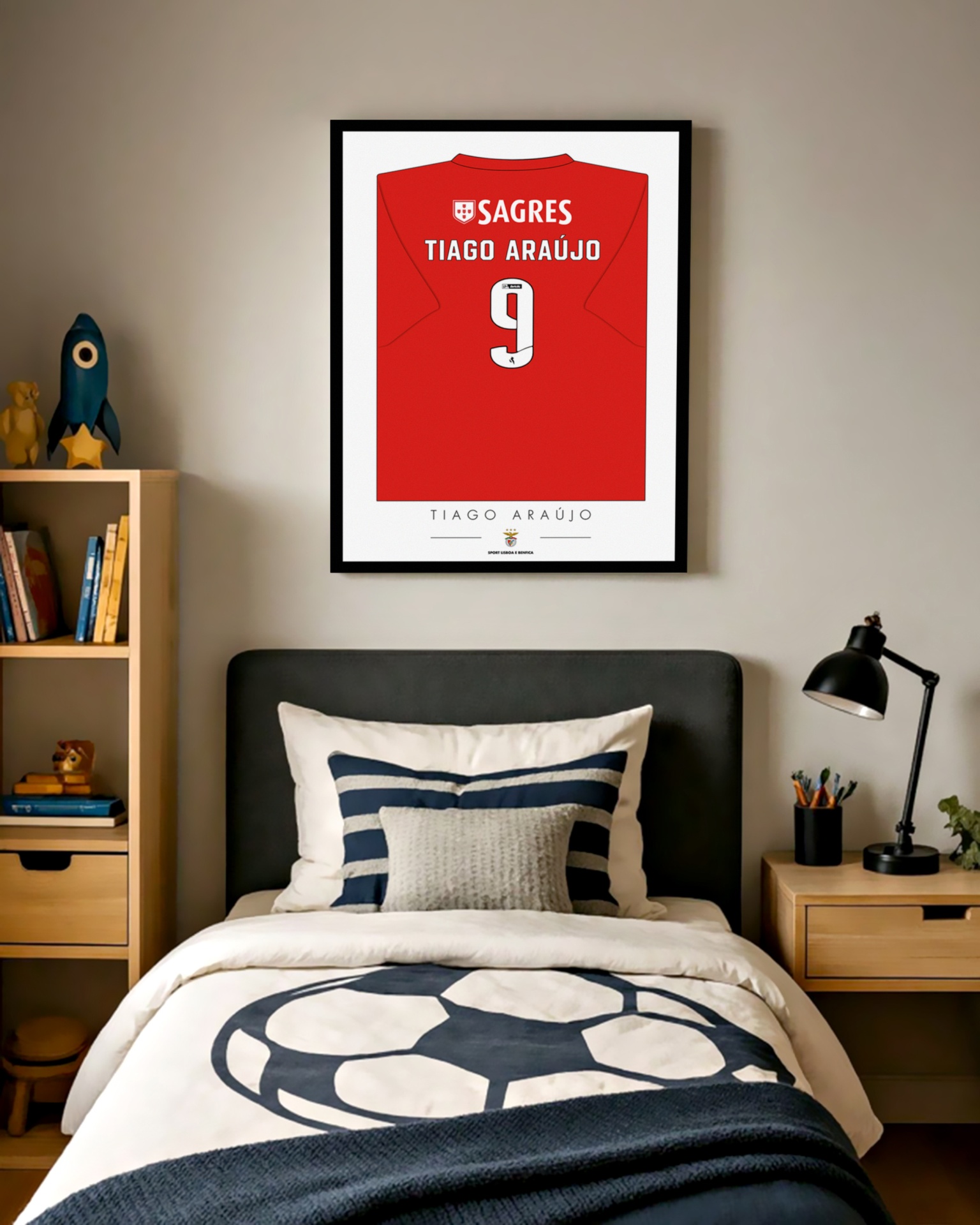 Transforme a paixão pelo futebol em arte com nosso quadro personalizado! Este design exclusivo apresenta a camisola do Sport Lisboa e Benfica. O presente ideal para os verdadeiros apaixonados por futebol