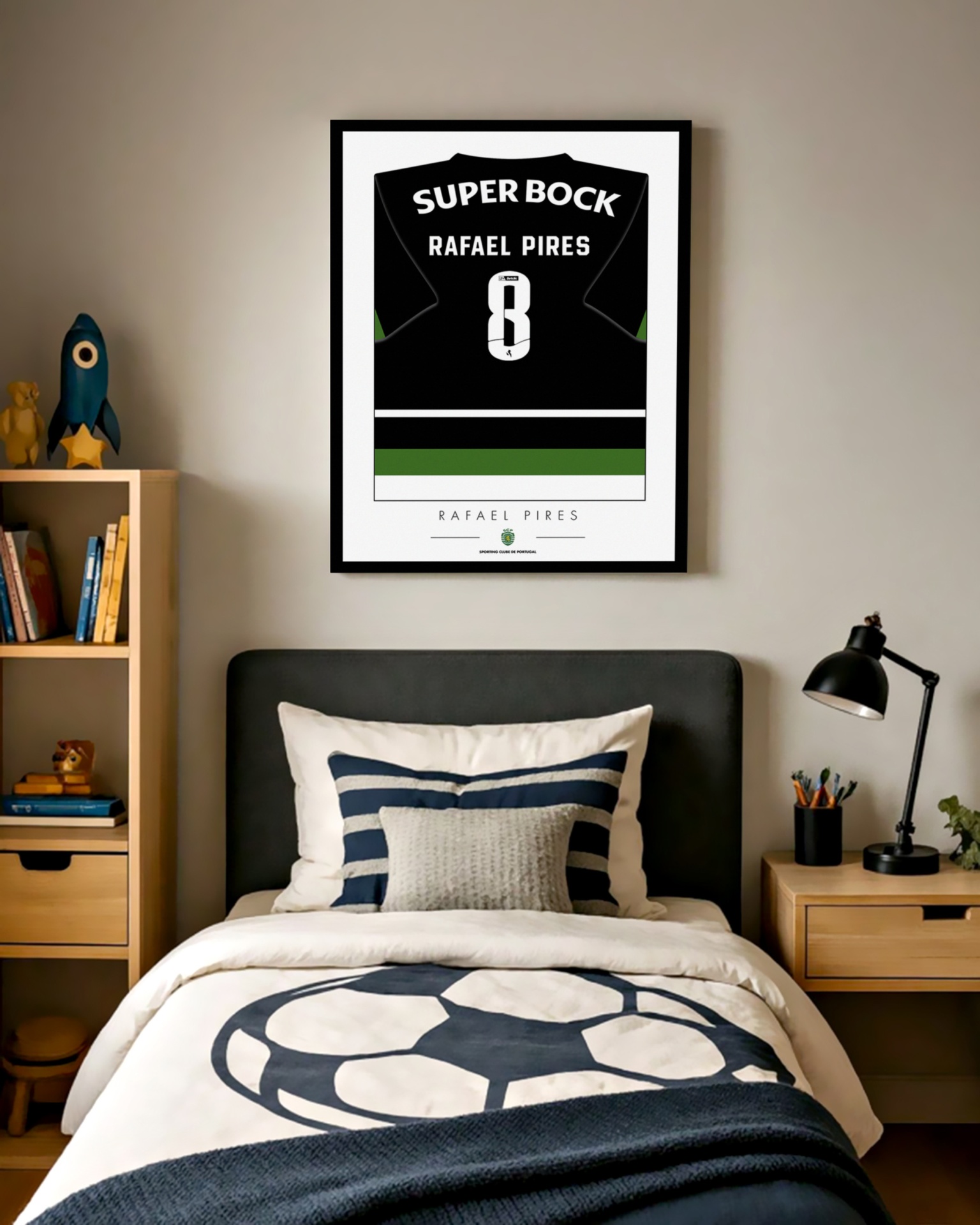 Transforme a paixão pelo futebol em arte com nosso quadro personalizado! Este design exclusivo apresenta a camisola do Sporting Clube de Portugal. O presente ideal para os verdadeiros apaixonados por futebol